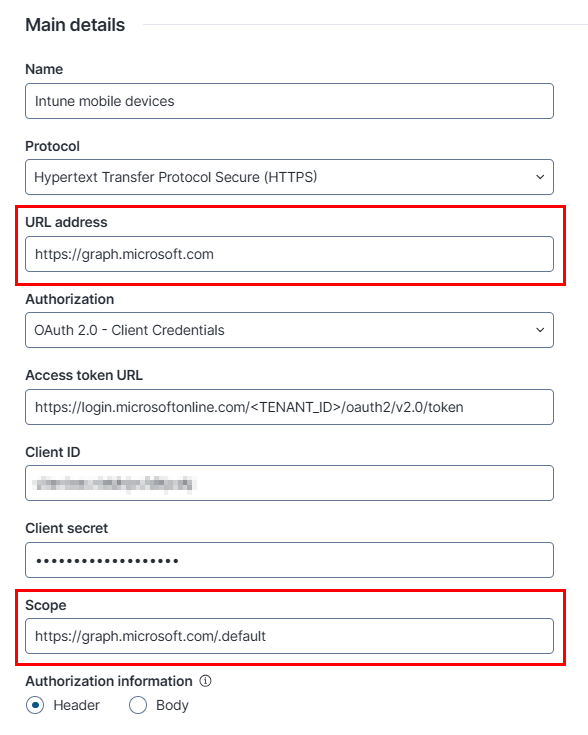 Nexthink retrieves Intune data through the Microsoft Graph API. Ensure to fill the following input fields accordingly: