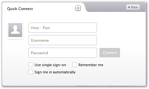 1. ログインダイアログの右上にある\*\*+新規**ボタンをクリックします。 ログインダイアログはセッション作成モードに切り替わり、クイック接続モードで以前に入力した情報、あるいは事前に選択したセッションからの情報を新しいセッションの**ホスト : ポート**と**ユーザー名\*\*フィールドにコピーします。 セッションはデフォルトでパスワードを保存しません。 同じセッションを頻繁に使用する場合にパスワードを記憶するよう指定できます。