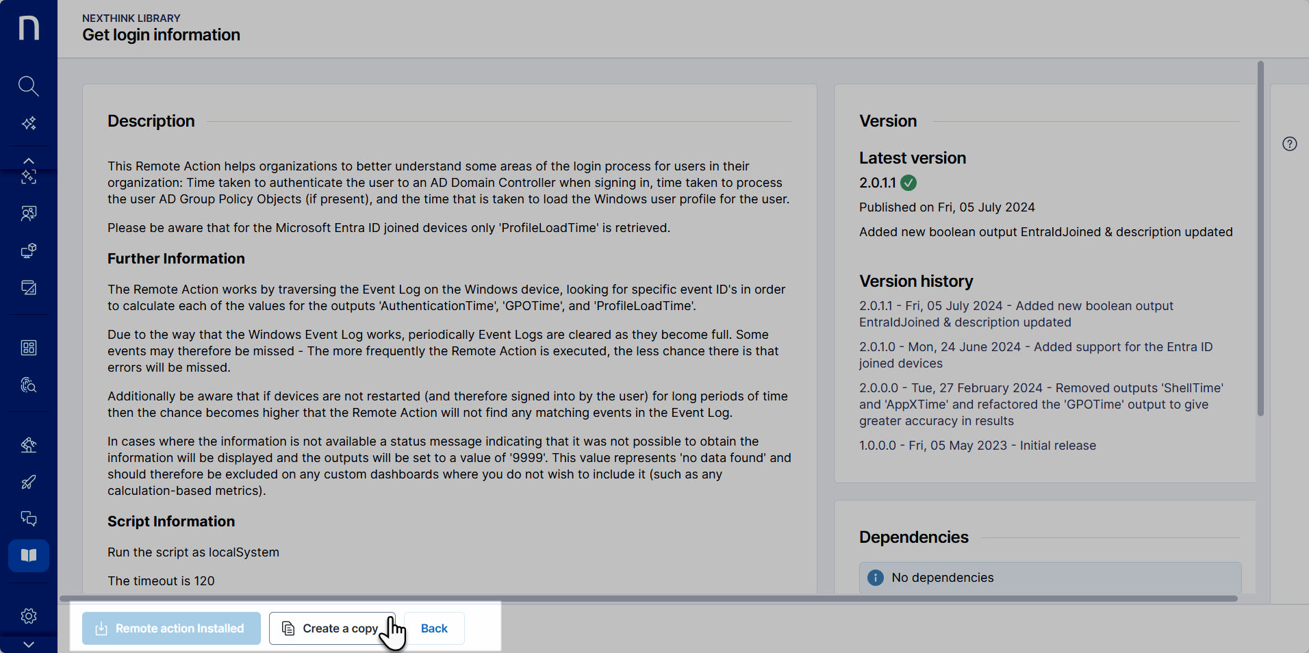 デフォルト設定を保持しつつ、別のユースケースに合わせたバージョンを作成したい場合に、コンテンツのコピーを作成するのが便利です。 コピーされたコンテンツは完全にカスタマイズ可能で、Nexthinkライブラリのオリジナルの項目に対する将来的な更新によって影響を受けません。