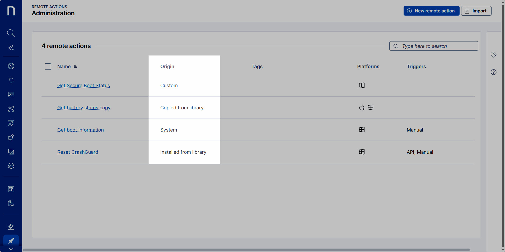 適切な権限を持つNexthinkユーザーは、**Nexthinkライブラリ**モジュールから追加の組み込みコンテンツを手動でインストールすることができます。 インストール後、これらの項目は対応するモジュール内に表示され、機能の**管理**ページで**ライブラリからインストール**としてラベル付けされます。