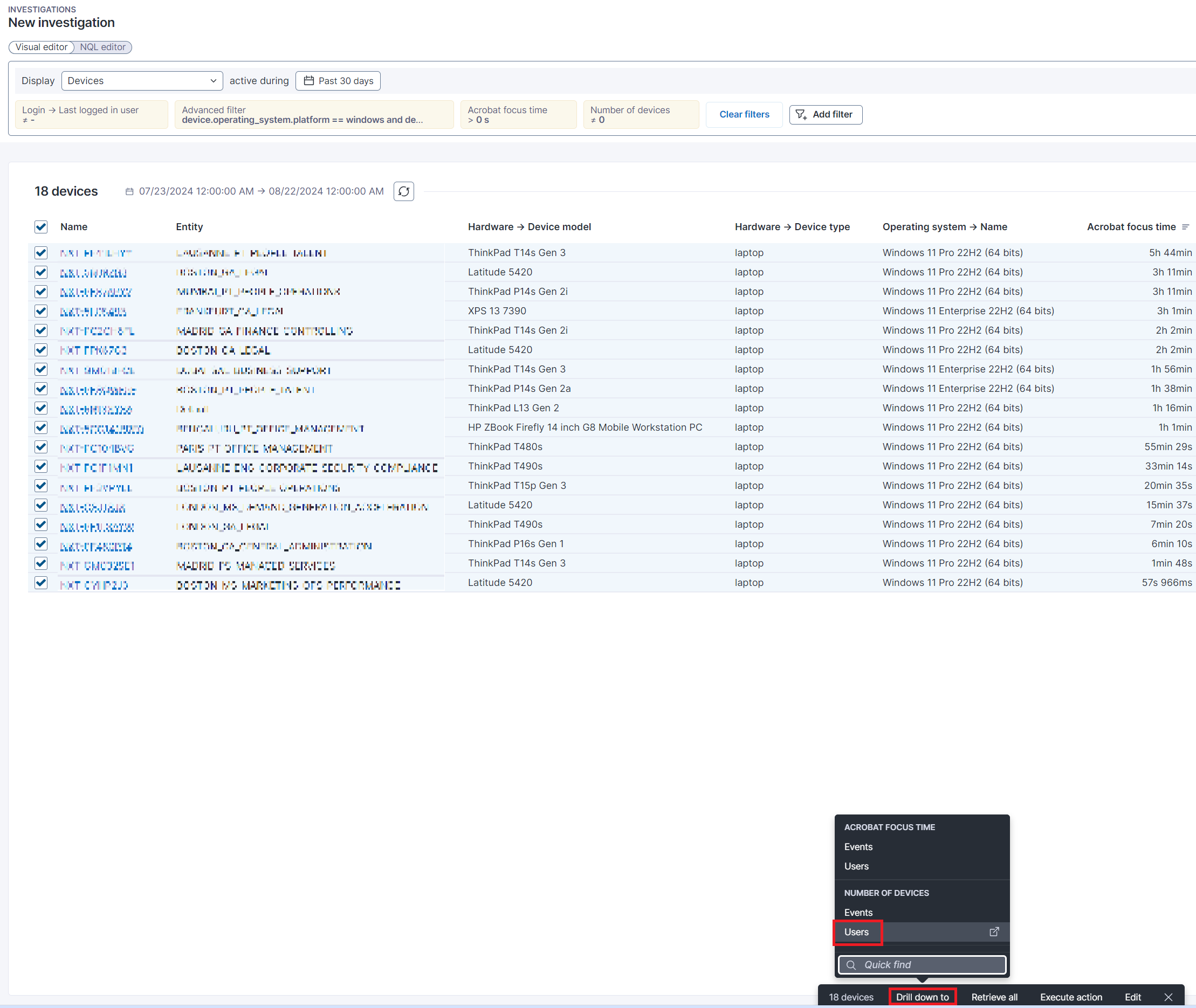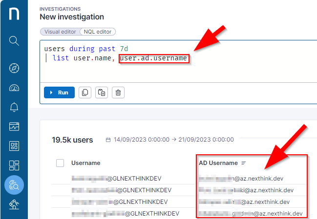このインテグレーションの結果、ユーザーUPNがNexthinkユーザーテーブルに入力されるべきです。 このユーザーUPNは、Graph APIコールを行う際にワークフローで利用されます。 以下のスクリーンショットは、Entra IDコネクタの設定例を提供し、適切に設定された場合、ユーザーテーブルがユーザー名で満たされることを示しています。