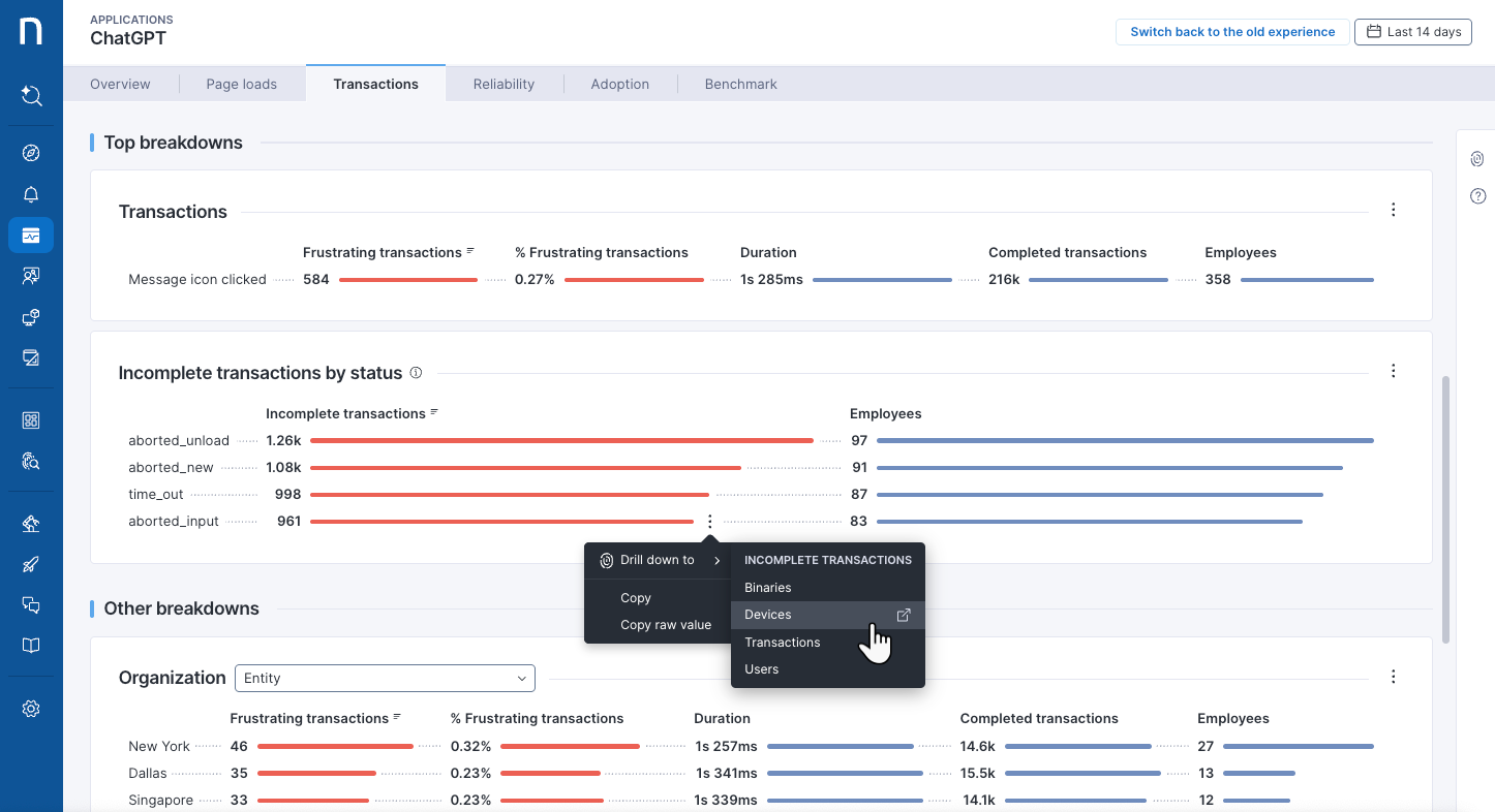 このワークフローは、従業員とのサポートコール中や一時的なローカル管理者権限の要求に応じて、特定のデバイスで開始されるよう設計されています。 それは、[デバイスビュー](https://docs.nexthink.com/platform/ja/user-guide/device-view)（以下に示すように）または[Amplify](https://docs.nexthink.com/platform/ja/configuring_nexthink/bringing-data-into-your-nexthink-instance/deploying-nexthink-in-non-vdi-environment/configure-amplify)からトリガーすることができます。 このワークフローでは、進捗を追跡するために**インシデント番号**パラメータを使用します。