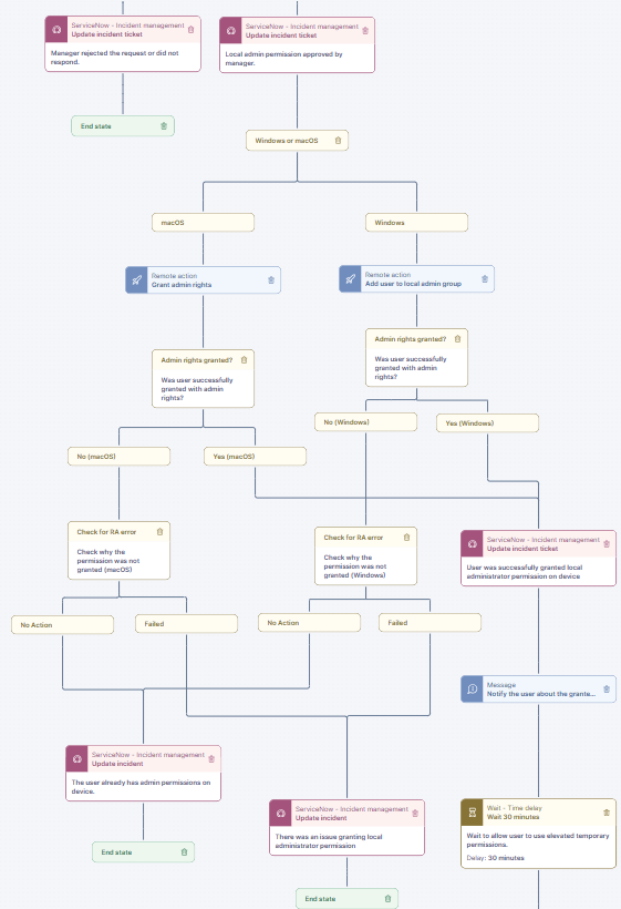 すべてのコンプライアンスチェックが完了し、マネージャーの承認が得られると、ユーザーはデバイスでローカル管理者権限を有することができます。 これは、WindowsおよびmacOSデバイスの両方で異なるリモートアクションを使用して実現できます。 いずれの場合もリモートアクションの成功をチェックし、失敗した場合は、ITSMチケットが更新されます。