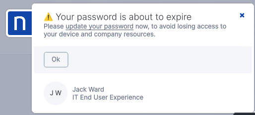 * 従業員にパスワードの有効期限を積極的に通知し、複数のコミュニケーションチャネルを通じてサポートを提供することで、従業員の全体的な体験を向上させ、フラストレーションを軽減できます。