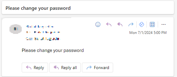それ以外の場合、ワークフローはEntra IDから従業員のマネージャーを特定し、マネージャーの名前で従業員にパスワード変更のリマインダーを送付するメールを送信します。 以下はそのようなメールリマインダーの例です。