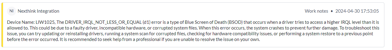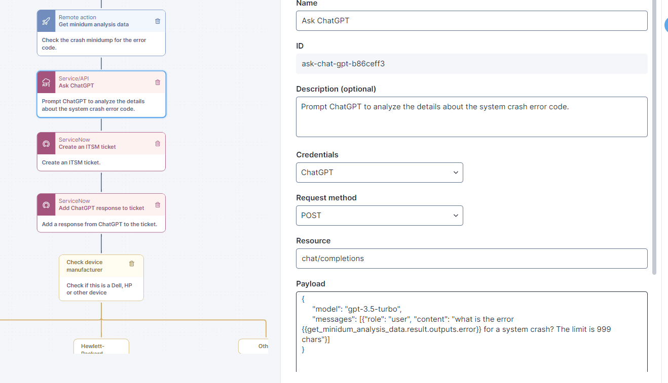 * Get BSODクラッシュミニダンプ分析リモートアクションが起動され、影響を受けたデバイスからシステムクラッシュの詳細が取得されます。 この情報はChatgptによって解析され、エラーコードが何を意味するかを理解し、自動的に作成されたチケットに追加されます。 この情報は、ITサポートに直接コンテキストを提供することで、エラーコードの重要性を手動で調査する必要を省き、重要な時間を節約できる可能性があります。