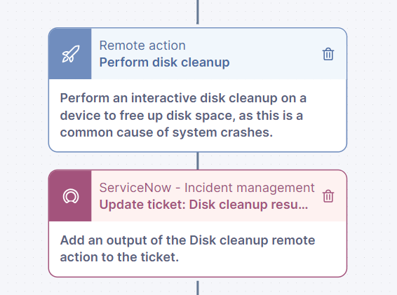 * ワークフローはその後、ディスクの空き容量不足がシステムクラッシュの一般的な原因と見なされるため、ディスククリーンアップを実行し、ドライバー更新手続きを行うための追加のディスク容量を要求します。 このクリーンアップはディスククリーンアップリモートアクションによって実行され、結果は前のステップで作成されたITSMチケットに入力されます。