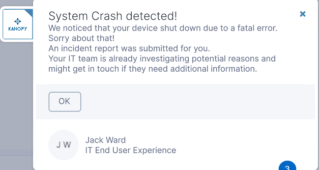 * ワークフローはシステムクラッシュイベントを検出し、リアルタイムで起動し、システムクラッシュの検出と調査中であることを従業員に通知します。