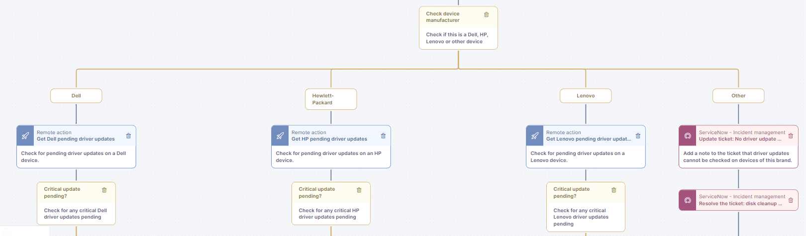 * ワークフローはその後、キーとなるドライバーのコンプライアンスチェックを実行します。これはシステムクラッシュの非常に一般的な根本原因です。 これは、製造元を確認し、保留中のドライバー情報を取得し、必要であればドライバーの更新を行うことによって実行されます。 このチェックはDellおよびHPデバイスで実行されます。