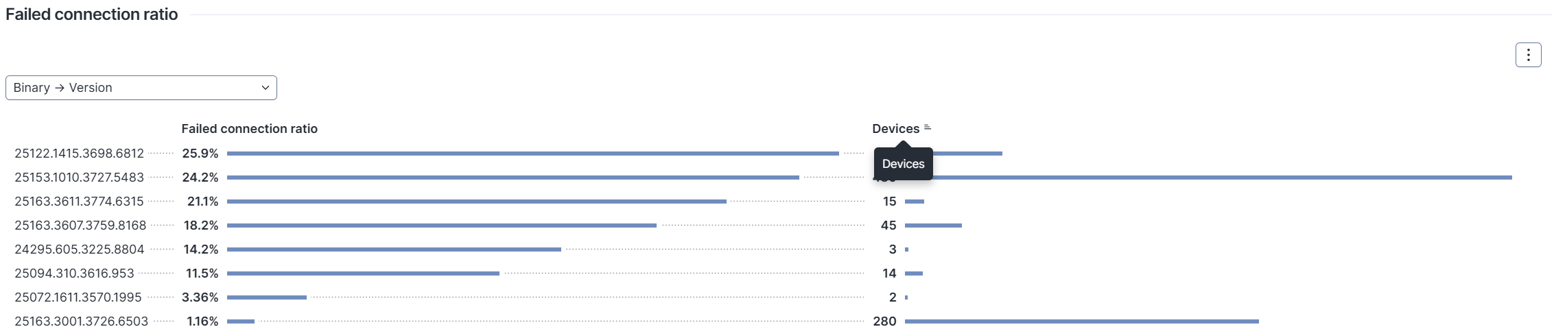 3. デフォルトでは、グラフは**接続失敗**比率に基づいて降順に並べ替えられています。 必要に応じて、「デバイス」ヘッダーをクリックして、影響を受けたデバイス数の多い順に並べ替えることができます。