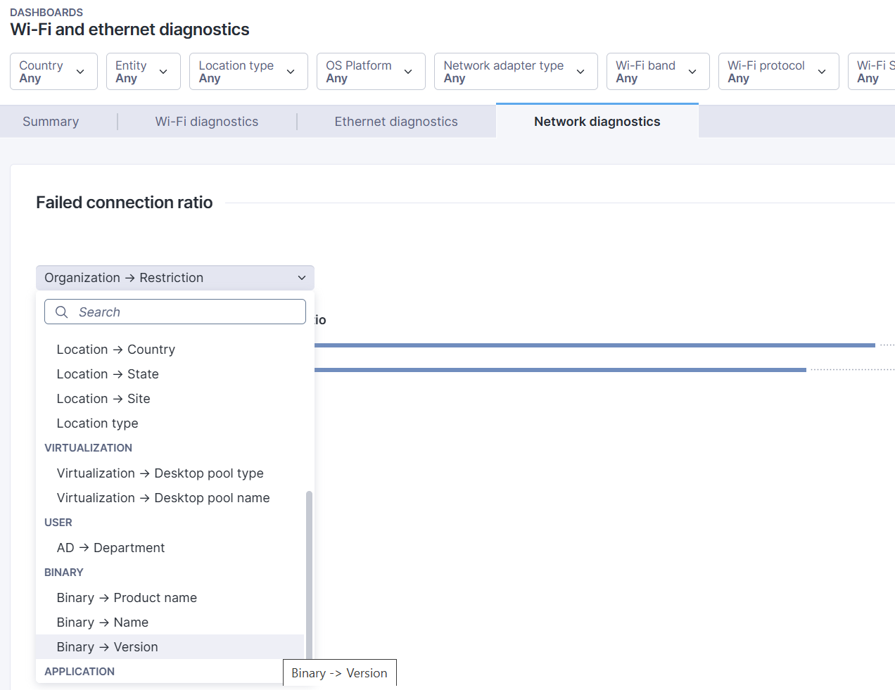 1. **バイナリプロダクト名**フィルタを使用して、分析したいアプリケーションを選択することから始めてください。
