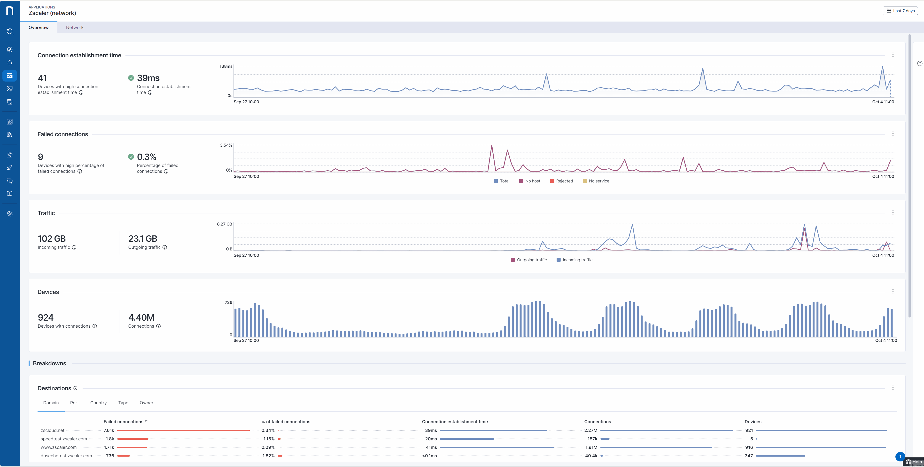 **Zscalerネットワークアプリケーション** は、接続性の健康状態やトラフィックを分析するために設計されています。 個々の目的地のドメインとポートを詳細に調査し、パフォーマンスを評価することができます。 この例では、ドメイン**zscloud.net**とポート**443**が目的地として選択され、Zscalerのトンネルデータの大部分を処理します。 このネットワークセグメントの接続性の健康状態を監視することは特に重要です。