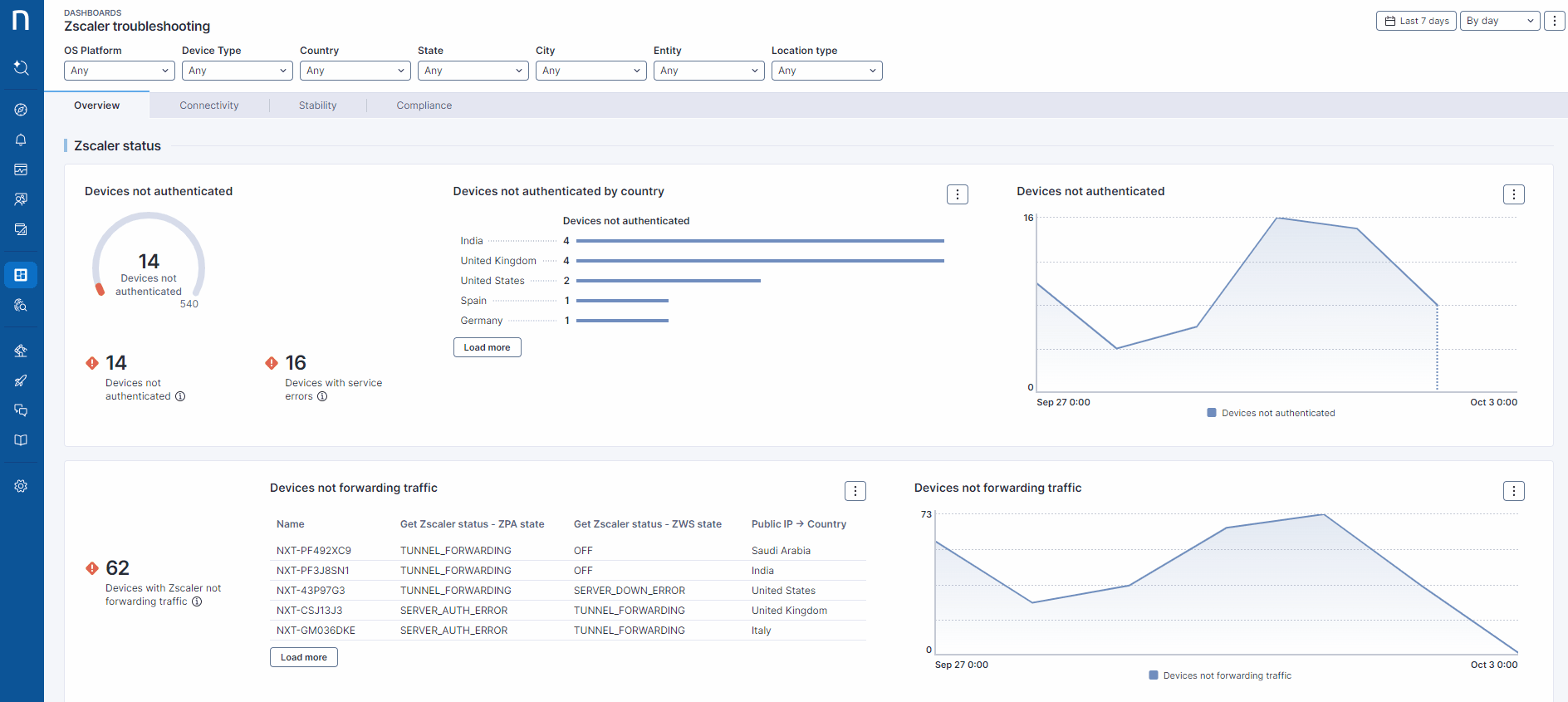 **"Zscaler トラブルシューティング"** [ライブダッシュボード](https://docs.nexthink.com/platform/ja/user-guide/live-dashboards)は、このライブラリパックの始点となります。 これは、Zscalerの現況を追跡し、問題や改善の余地を簡単に特定するための可視性を提供します。