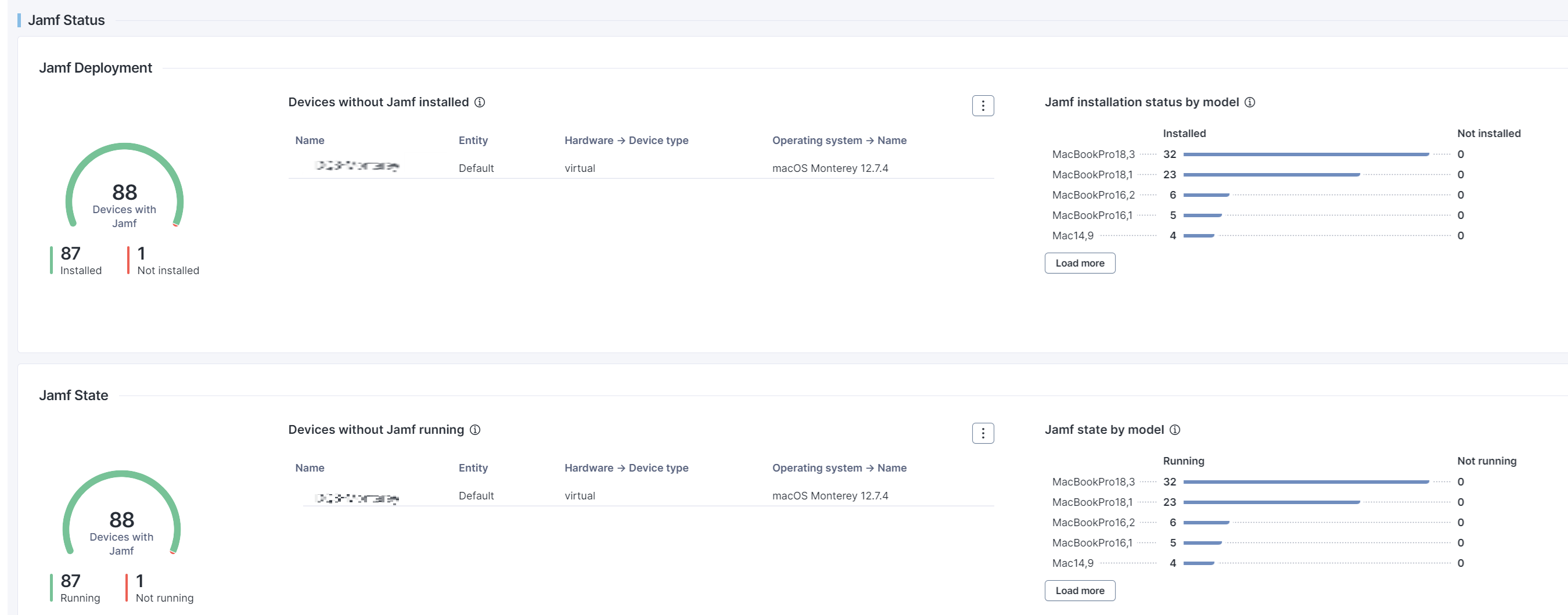 **Jamf ステータス** セクションは、Jamf エージェントがインストールされていないか、または Jamf エージェントが動作しておらず、企業のポリシーに準拠していない可能性があるため、セキュリティ リスクを引き起こす恐れのあるデバイスを特定するのに役立ちます。