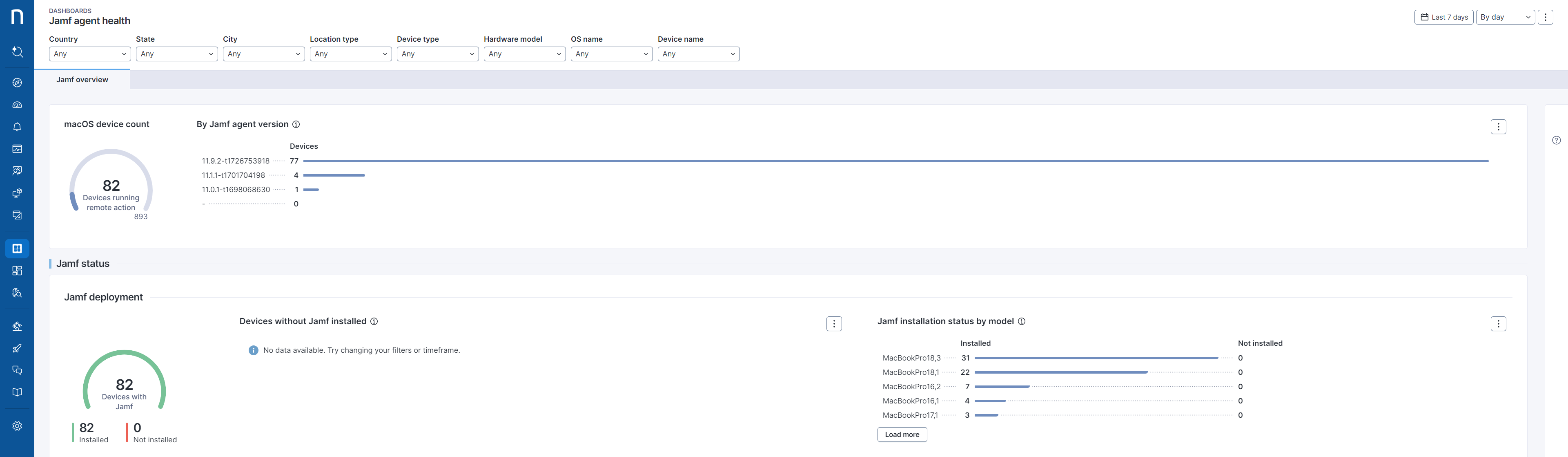 このLibrary packは、macOSデバイス上のJamfエージェントの存在、正常性、準拠状況、状態をリアルタイムで監視するのに役立ち、エージェントの健康状態や欠落したエージェントなどの問題を検出するためのオールインワンのdashboardを提供します。