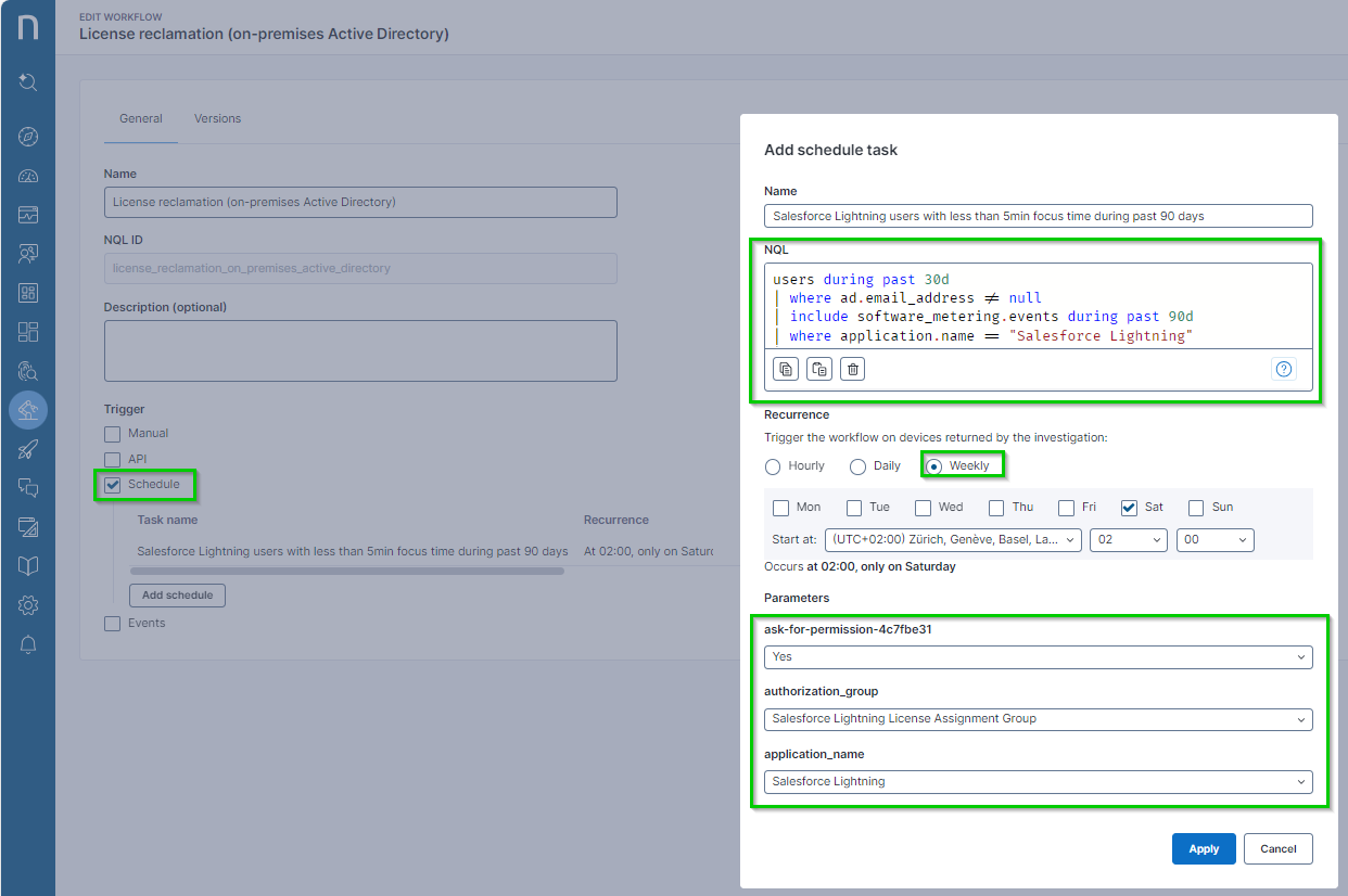 ライブラリのコンテンツを標準ユーザーとして使用するには、[使用ガイド: ライセンス回収について](https://docs.nexthink.com/platform/ja/library-packs/software-asset-management/workflow_-license-reclamation/usage-guide-license-reclamation)を参照してください。