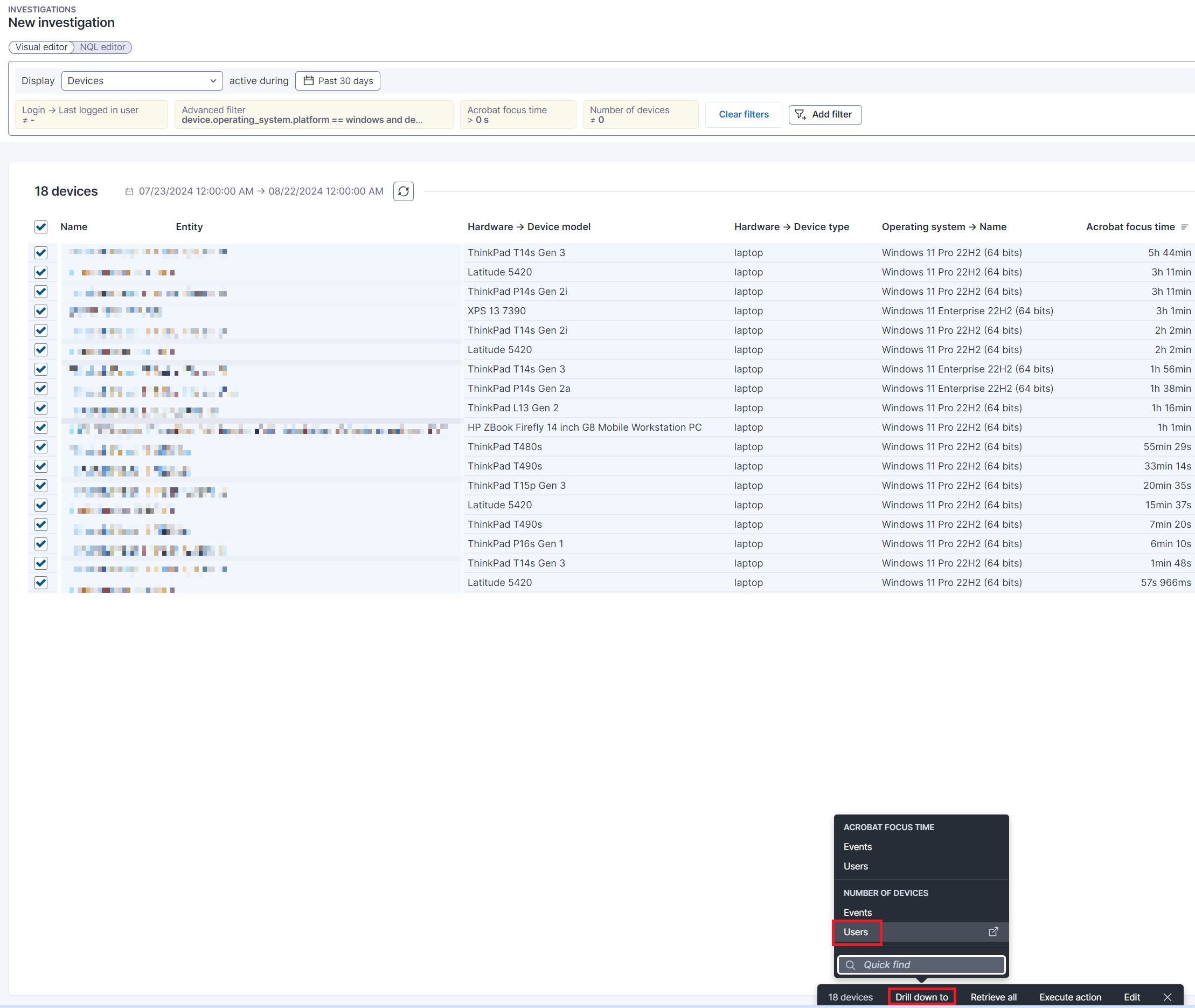 Nexthink Infinityは、リアルタイムのアラート、診断と分析、自動化と修復により、従業員のデバイス、アプリケーション、オペレーティングシステム、物理的な場所、ネットワーク接続などを可視化します。