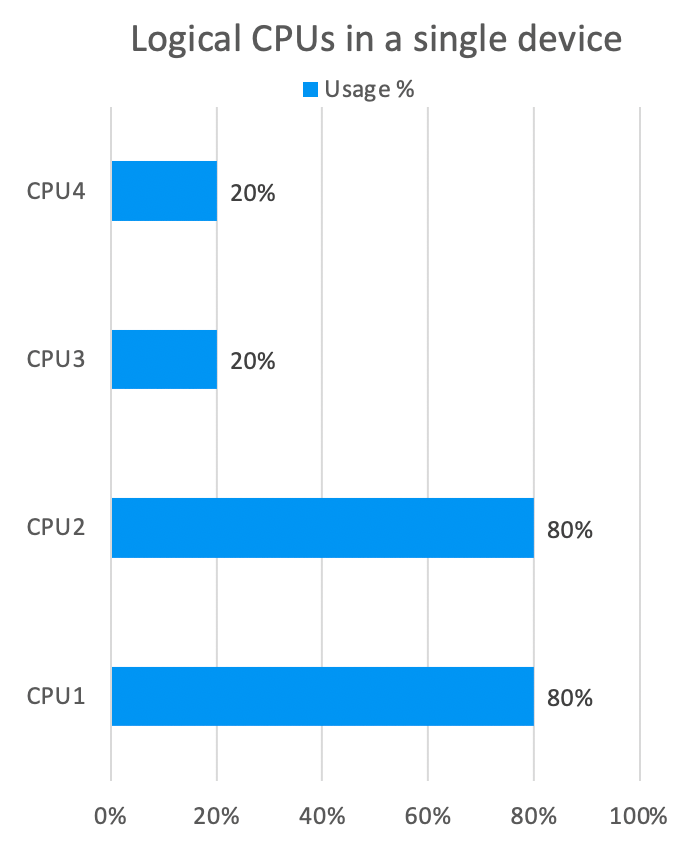 正規化された CPU 使用率は、利用可能な処理能力のどのくらいが利用されているかを示します。 この値は、総 CPU 使用率を論理 CPU の数で割ることで計算されるため、100％を超えることはできません。 たとえば：