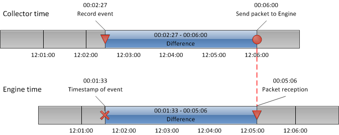 EngineがCollectorからパケットを受信すると、システム時間を使用して受信時間を記録します。 イベントのグローバル時間を計算するために、Collectorパケットが従業員のコンピュータからEngineに送信される時間は無視できるとEngineは仮定します。 この方法で、Collectorがパケットを送信した絶対時間は、Engineでのパケット受信の絶対時間と同じと見なされます。 したがって、送信直前にパケットでCollectorが設定した時間は、システムブートに対する従業員機のローカル時間であり、Engineがパケットを受け取る時間と等しくなります。 イベントが発生した時間を取得するために、Engineは受信時間からパケットのローカル時間と各イベントの差を引きます。以下の図に示すように: