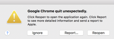 Macプラットフォームの場合、NexthinkはmacOSの標準ログを使用してクラッシュイベントを記録するすべてのアプリケーションのクラッシュを報告します。 アプリケーションが標準的な手段でクラッシュを報告する場合、macOSには警告が表示されます。 警告を引き起こすすべてのアプリケーションクラッシュは、Nexthinkによって正確に報告されます。 たとえば、Chromeがクラッシュすると、macOSユーザーには次のような警告が表示されます：