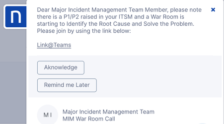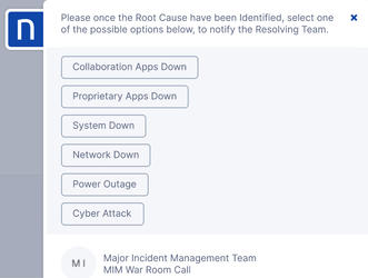 * MIMチームメンバーが「確認」をクリックすると、Nexthinkは彼らがウォールームの通話に参加するためのリンクを使用したと見なします。 その後、チームメンバーが P1/P2 インシデントの考えられる根本原因のリストから選択できるように、システムが別の緊急キャンペーンを送信します。