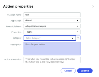 3. 「Actionプロパティ」で関連プロパティを入力し、「Submit」をクリックします。