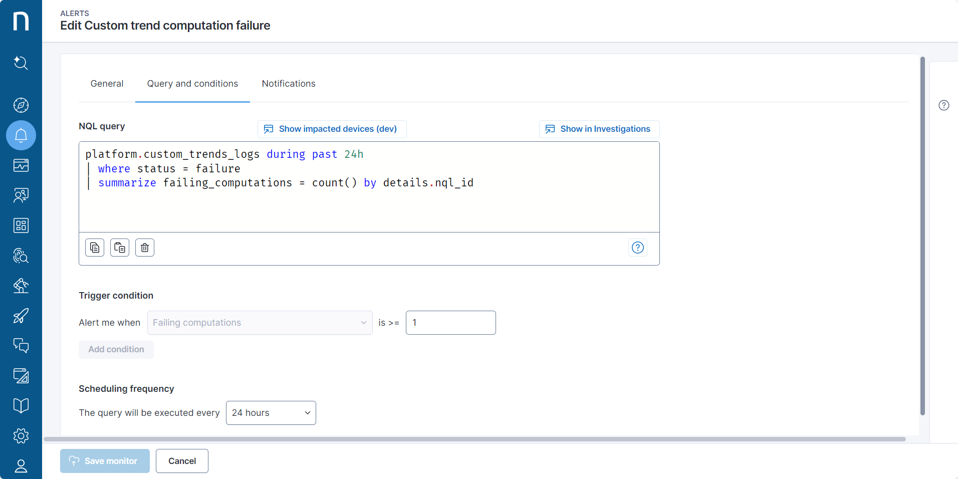 詳細については、「[カスタムモニターの作成](https://docs.nexthink.com/platform/ja/user-guide/alerts-and-diagnostics/managing-alerts/creating-custom-monitors)」ページを参照してください。