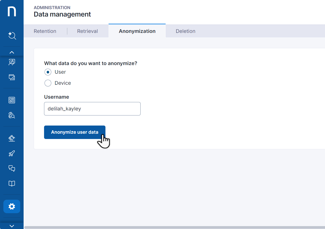 プロセスを開始するには、**ユーザーデータを匿名化** または **デバイスデータを匿名化** ボタンをクリックします。