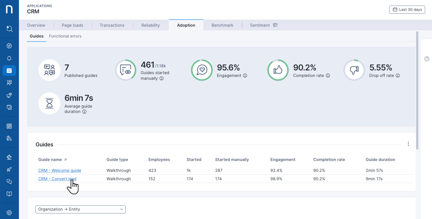 **組織**のテーブルは、組織の分類によるメトリクスを表示します。 ドロップダウンリストから組織レベルを選択します。 詳細については、[製品設定](https://docs.nexthink.com/platform/ja/user-guide/administration/system-configuration/product-configuration)ドキュメントを参照して、エンティティとカスタム分類を定義する方法について学んでください。