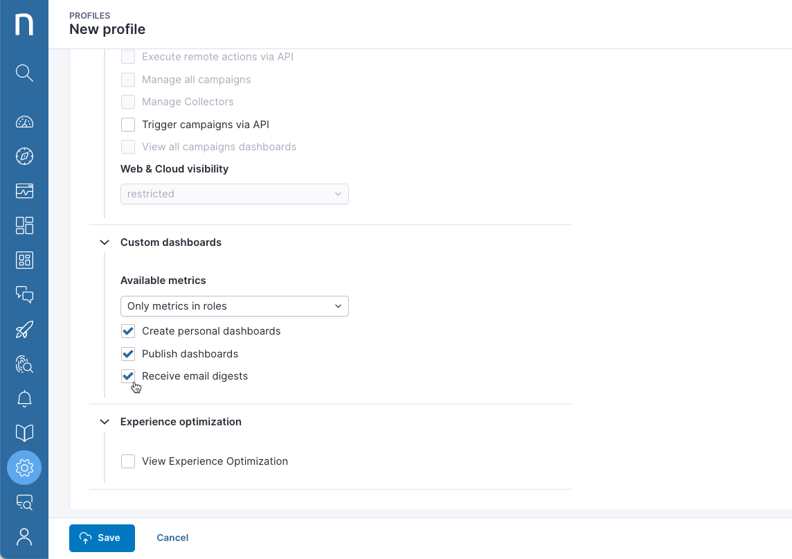 * 編集プロファイルページにて **Custom dashboards and Finder permissions** タブを選択します。