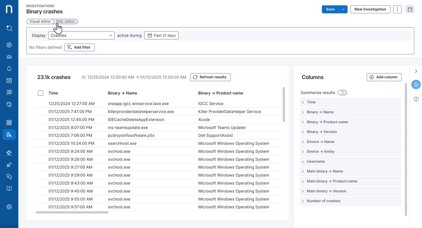 [調査の作成](https://docs.nexthink.com/platform/ja/user-guide/getting-started-with-investigations#creating-investigations)を行った後、調査ページの左上にあるトグルを使用して**ビジュアルエディタ**と**NQLエディタ**の間を切り替えて、調査クエリを構築してください。