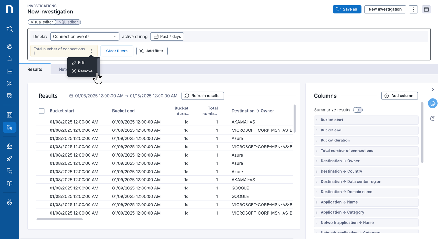 **ビジュアルエディター**を使用して、NQLやNQLデータモデルをマスターすることなく、強力で柔軟な調査を作成できます。