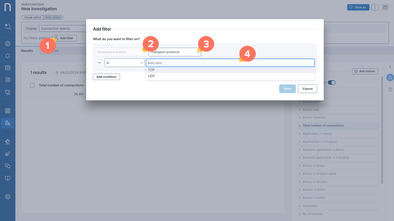 以下では、**接続イベント** 調査結果に **TCP** フィルタを追加する手順を例示します: