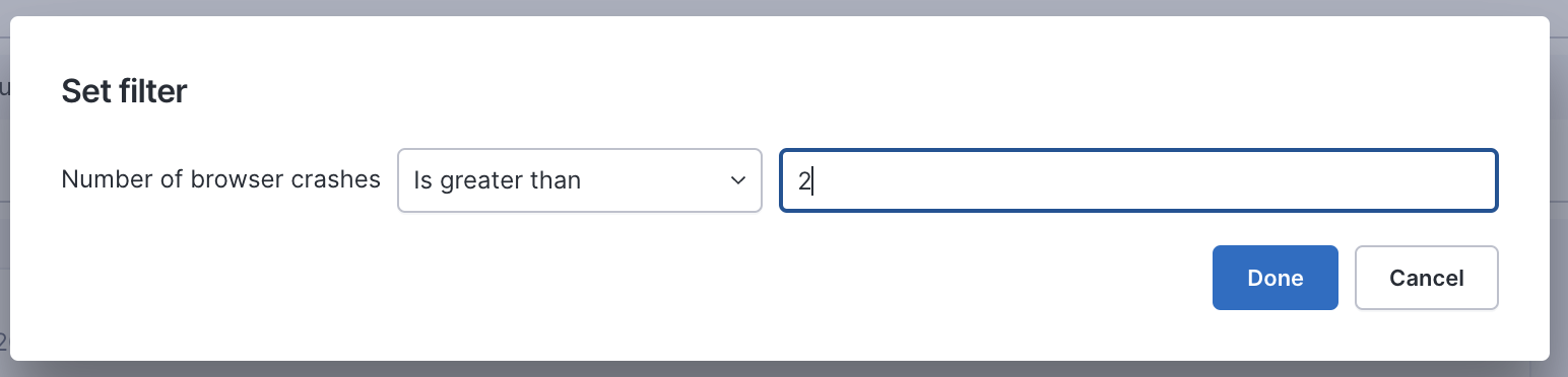 2. 列ヘッダーアクションメニューから **フィルタ…** を選択して、**フィルタを設定** ポップアップを開きます。 条件演算子と条件の1つまたは複数の値を選択します。 このケースでは、`2より大きい`。
