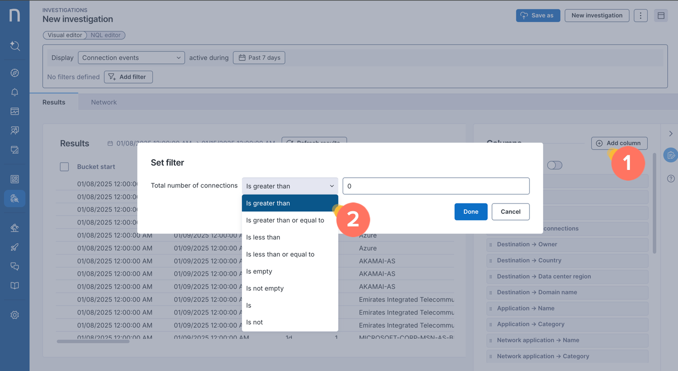 以下の例では、調査結果アイテムから **接続数合計** フィールドに `is '1'` フィルタを追加する手順を示します。