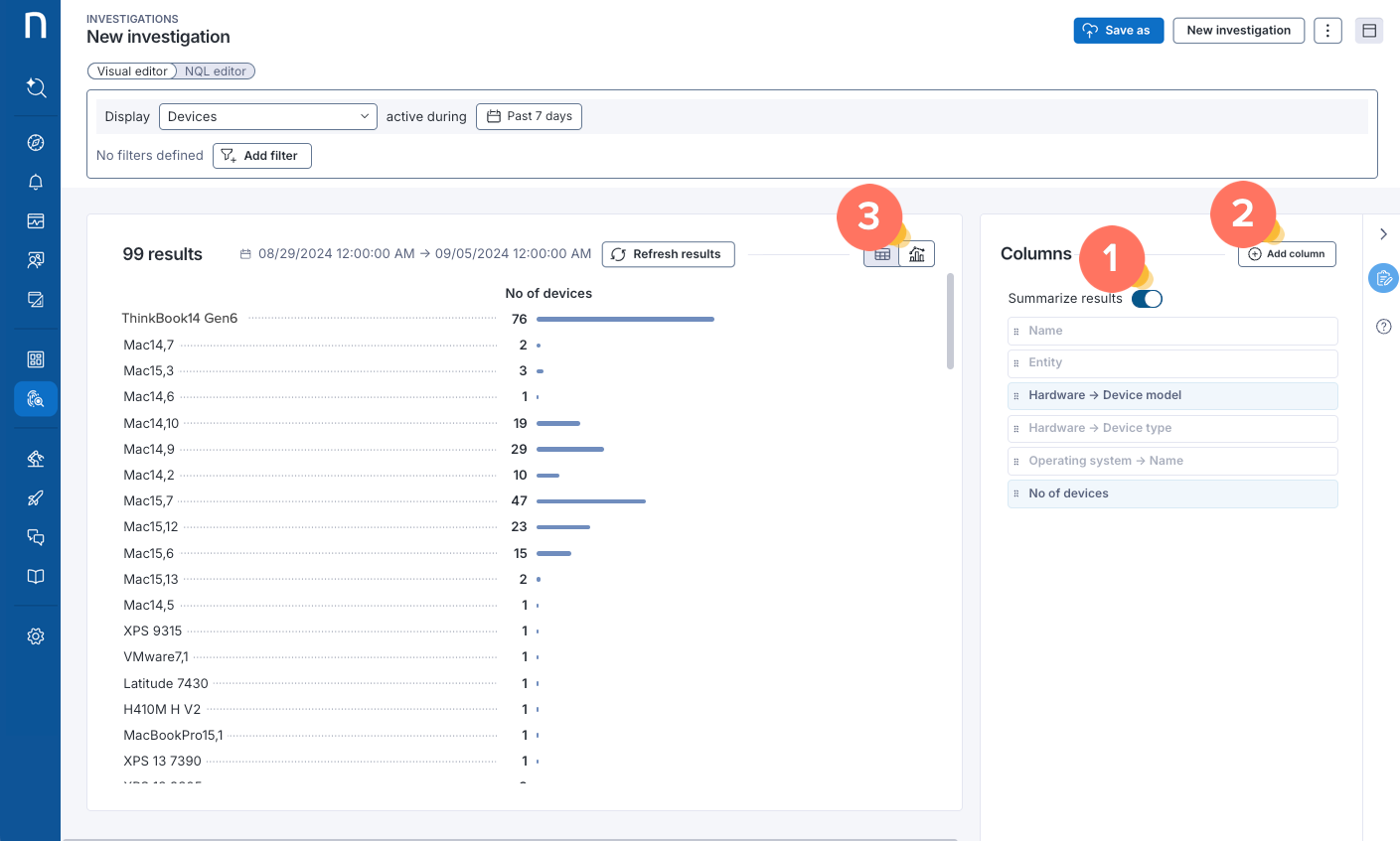 * ビジュアルエディター内で **ハードウェア -> 製品ID** フィールドを追加することは、NQLエディターでの `summarize... デバイス.hardware.model で` in the NQL editor. 以下のクエリを参照してください。
