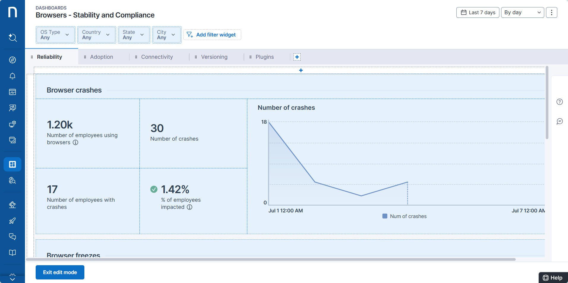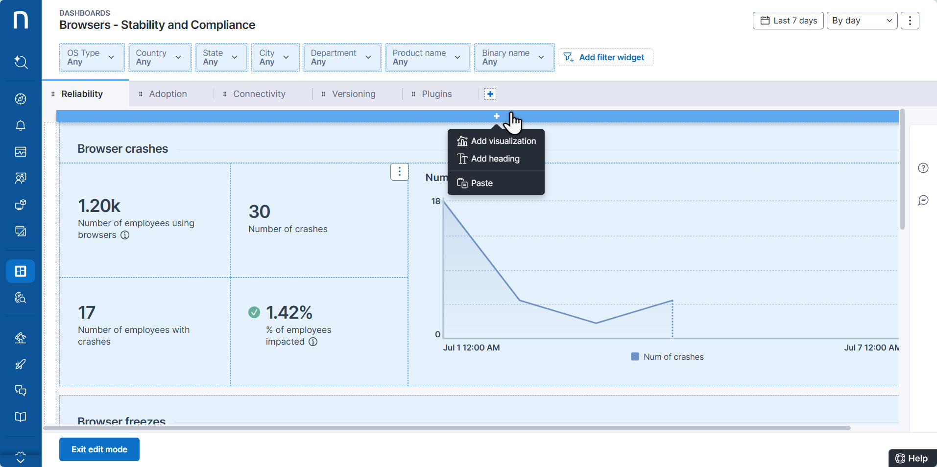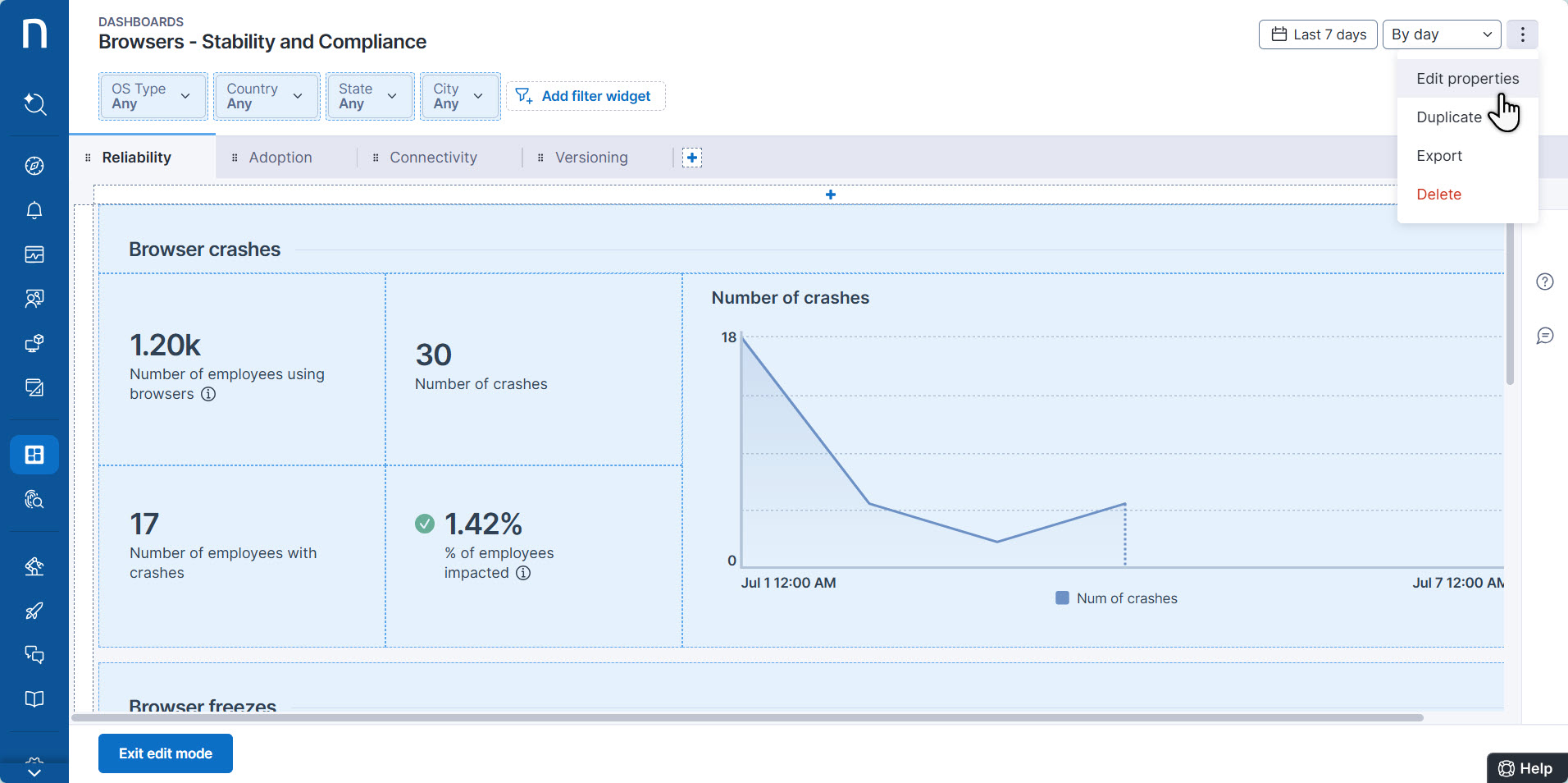 **編集モード**をアクティブにすると、NexthinkのWebインターフェースは編集可能なダッシュボード要素をライトブルーで表示します。
