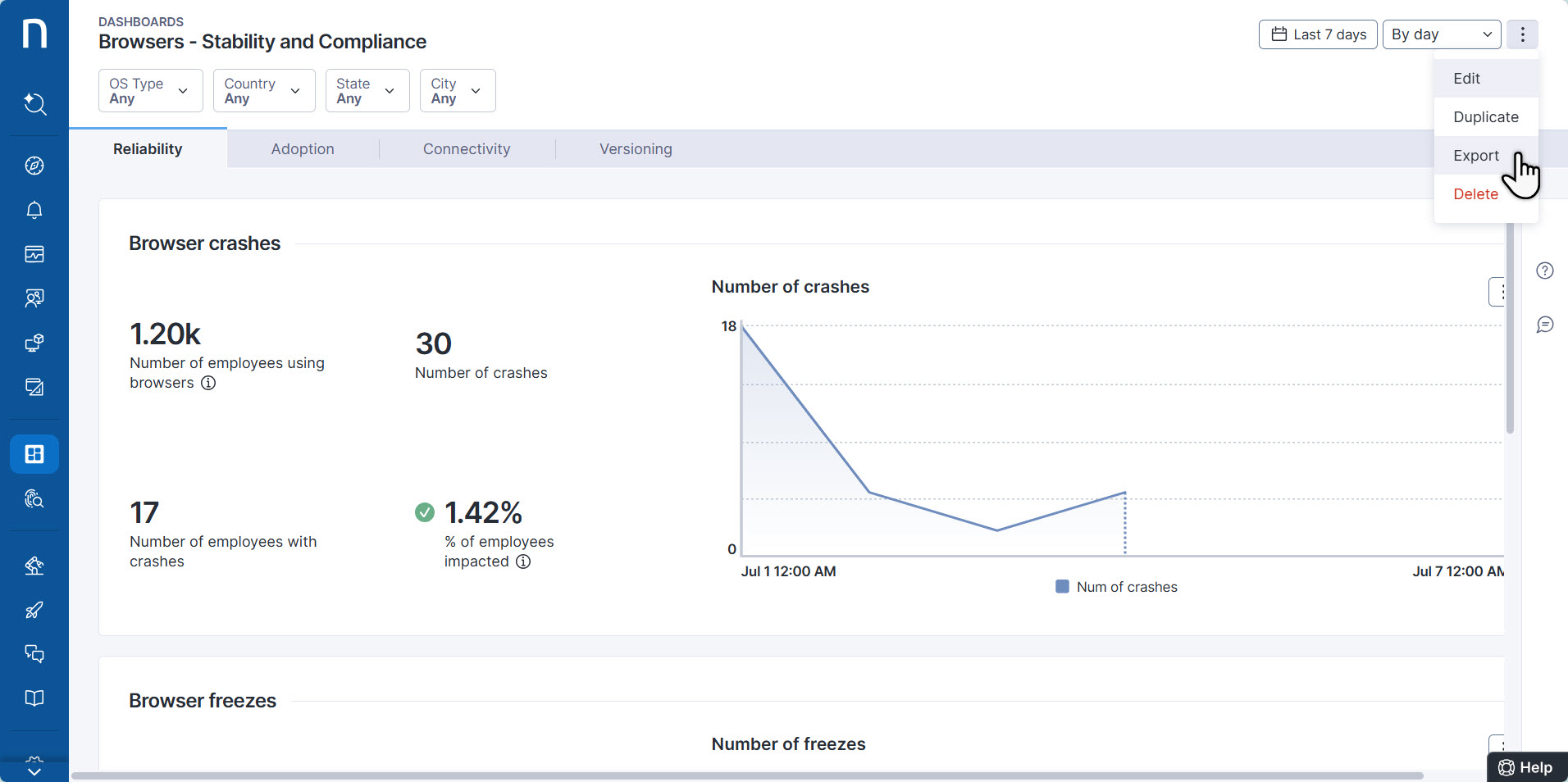 様々なウィジェット選択肢と強力なNexthinkクエリ言語（NQL）を備えたダッシュボードビルダー、ライブダッシュボードを使用して、ダッシュボードを作成および維持します。これにより、データの可視化と掘り下げの可能性が広がります。