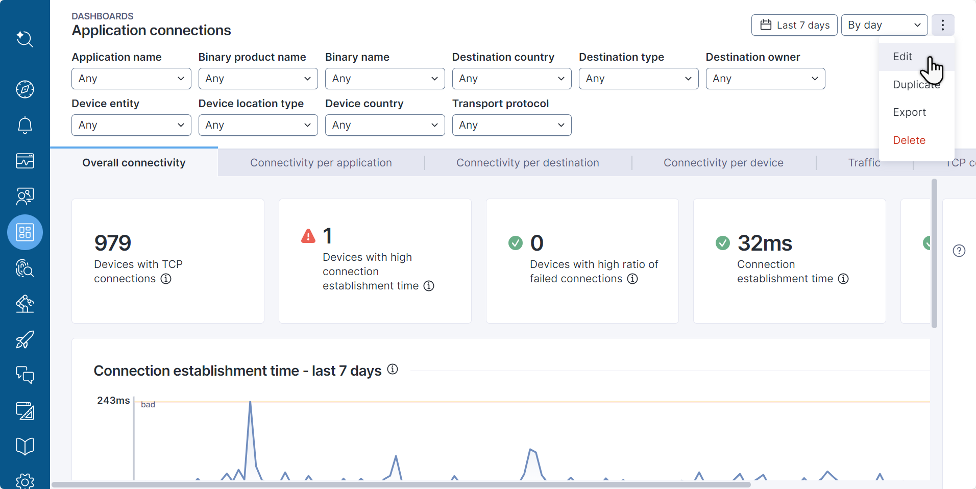 ダッシュボードページの右上隅にあるアクションメニューをクリックして、ライブダッシュボードを**編集**および**エクスポート**します。