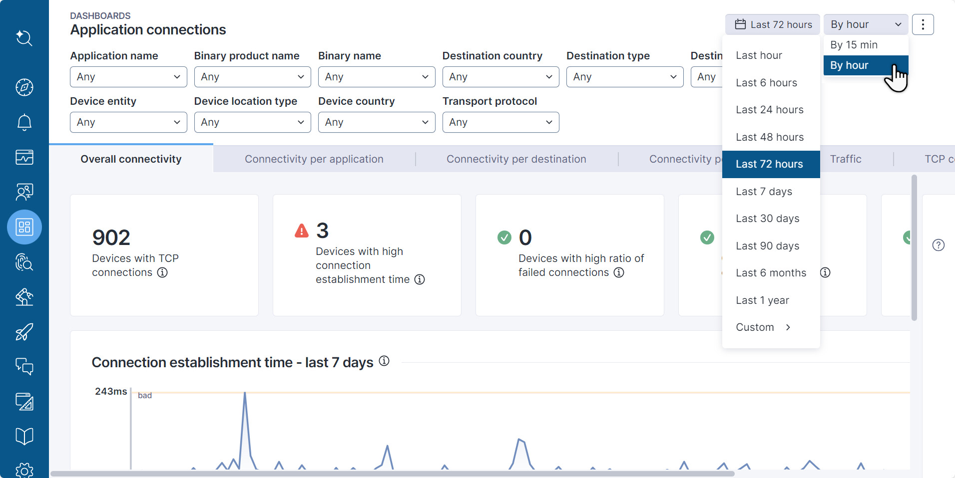 選択した期間に応じて、パターンを特定し、問題をトラブルシューティングするために、時間の粒度を**15分単位**、**1時間単位**、**1日単位**、**1週間単位**、**1ヶ月単位**に設定できます。 時間の粒度の変更は、ラインチャートのみに更新を適用します。