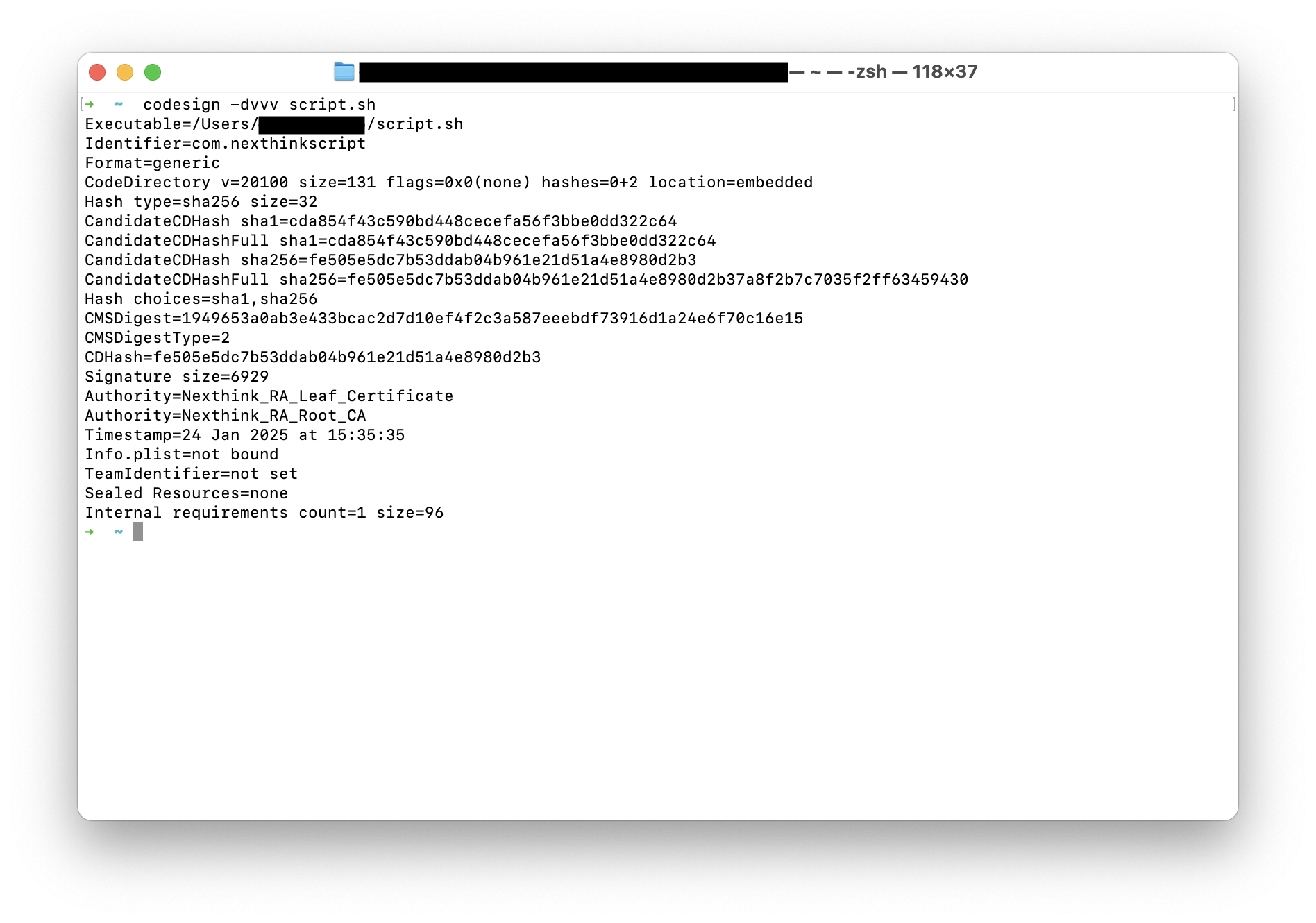 スクリプトファイルの署名は、ファイルに関連付けられたファイルシステムの拡張属性で生成されます。 コードサインの詳細を取得し署名を検証するためにcodesignユーティリティを使用してください。