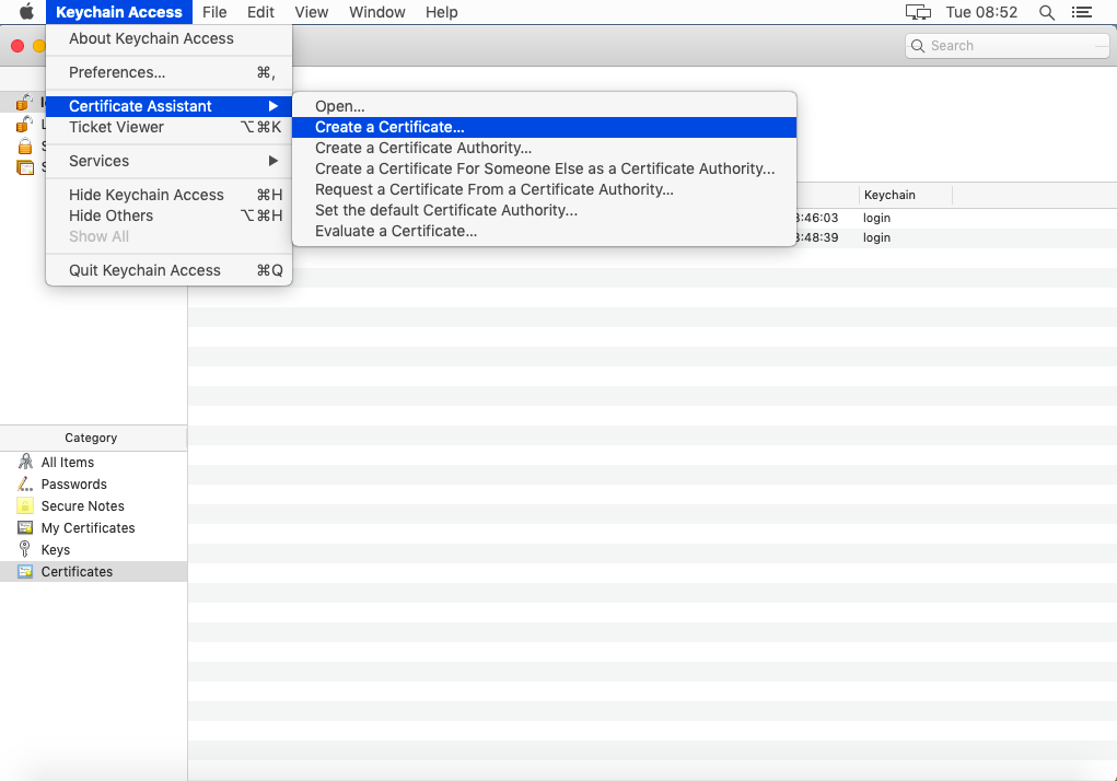 * Keychain Access > 証明書アシスタント > **証明書を作成...** に進みます。