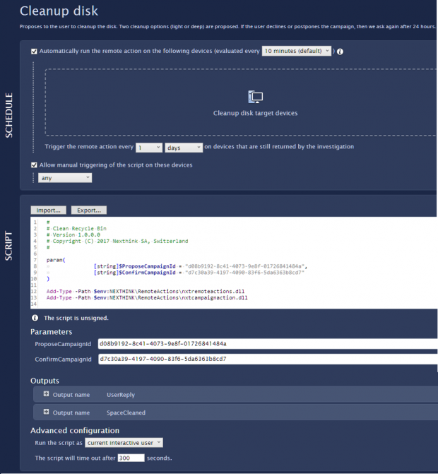 リモートアクションのエディターで、**インポート...をクリックしてスクリプトをリモートアクションにリンクします。 Finderはスクリプトのソースを解釈し、スクリプトの下に検出されたパラメーターと出力の両方を一覧表示します。 スクリプトのパラメーター**は以前に作成された2つのキャンペーンのUidsであり、**出力**はユーザーの応答とクリーンアップされたディスク空き容量のサイズです。