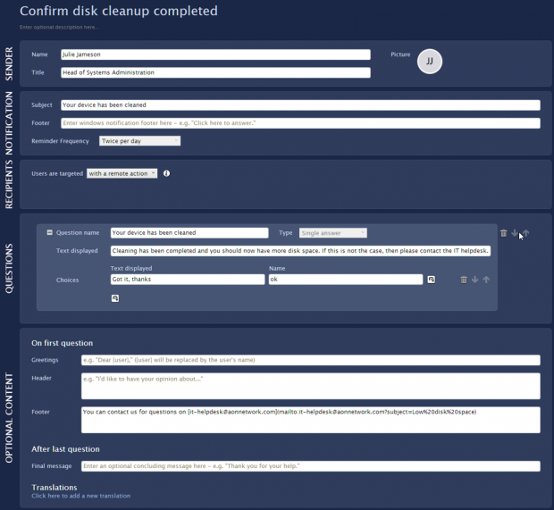 * **ディスククリーンアップ完了を確認してください**。このキャンペーンは、前回のキャンペーンでディスククリーンアップを拒否しなかった限り、クリーンアッププロセスの終了時にユーザーに通知します。