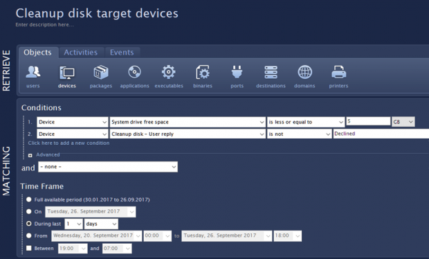 トリガー期間として、リモートアクションは1日を指定します。 この方法で、デバイスが引き続き低空きディスクスペースの問題を抱えている場合は、リモートアクションは短期間で同じユーザーを煩わせることなく、代わりに次の日まで待ちます。