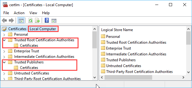 さらに、スクリプトに署名するための証明書がプライベートCAによって生成された場合（つまり、Windowsの信頼されたルート証明機関証明書ストアにすでに存在しないCAのルート証明書を持つ場合）、CAのルート証明書を信頼されたルート認証局証明書ストアに追加します。 同様に、スクリプトに署名するために中間証明書を使用した場合、中間認証局証明書ストアに中間証明書のフルチェーンを含めます：