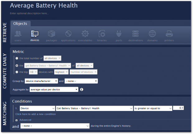 2番目の数量指標の例では、ラップトップデバイスのバッテリーステータスに関する情報を取得します。 これはデフォルトではNexthinkが取得する情報ではないため、オンデマンドデータを返すリモートアクションが必要です。
