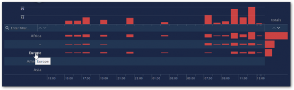 現在の時間間隔の右側には、過去24時間のメトリックの合計値をグループ化したバーがあります。 他のすべてのバーとは対照的に、合計値を持つバーは水平方向に成長します。 バーグラフの各行はそれぞれの合計を表示するので、それらの値を視覚的に比較することができます。 行は、メトリックの合計値に基づいて並べ替えることができます。 過去24時間の合計値で行を並べ替えるには：