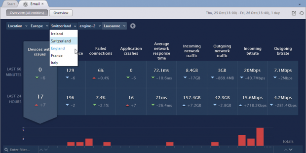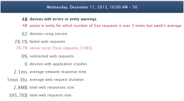 現在選択されているメトリックはウィンドウでハイライトされています。 メトリックに加えて、要約には特定のエラーや警告を持つデバイスに分割した問題のあるデバイスの数が含まれます。 例えば、選択した時間に2つの異なるデバイスでアプリケーションクラッシュが発生した場合、*2アプリケーションクラッシュあり* というメッセージが表示されます。 エラーメッセージは赤色で、警告は黄色です。