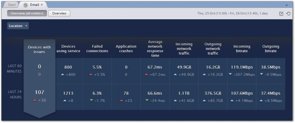 サービスのパフォーマンスを測定するメトリクスは二行に分かれています。 最初の行は直近60分間の短期間のサービス状態を示し、第二の行は過去24時間の長期間の状態を提示します。 各メトリクスにおいて、60分または24時間の期間中の現在の値と前期間との比較による差分が得られます。 例えば、現在の時間が16時40分の場合（10分ごとの解析）、15時40分から16時40分までの直近60分のスパンと、14時40分から15時40分までのスパンとの比較も計算されます。 差分に矢印のインジケータが付いています。 現在の値が前の値よりも大きい場合は矢印は上を向き、小さい場合は下を向きます。 さらに、矢印の色はメトリクスの値の変化がサービスの改善または劣化を意味するかどうかを示します。なぜなら、この場合、必ずしも大きい方が良いとは限りません。 例えば、失敗した接続数が増加することはサービスにとって悪い兆候です。 サービスが改善されたとき、矢印は緑色で表示され、サービスが劣化したときは赤、メトリクスが情報提供のみでサービスの品質に中立の場合は青で表示されます。